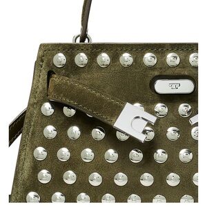 Elegant olive green satchel featuring striking silver accents. Ideal for a sophisticated look.