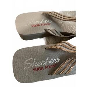 Comfortable Skechers flip flops featuring Yoga Foam technology for enhanced cushioning. Beige color with decorative rhinestone accents on the straps for a subtle sparkle. Lightweight and easy to slip on, ideal for casual wear or beach outings.