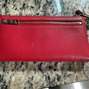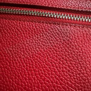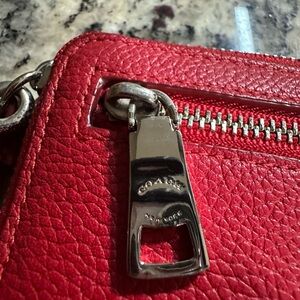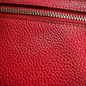 The Coach Medium ID Zip Wallet in pebbled leather is a stylish and functional accessory for women. This bold red wallet features a solid pattern with pebble texture, a zipper closure, and various accents like a strap, zipper pull, and the brand logo. Measuring 6.5 inches in length and 3.75 inches in width, this wallet is perfect for on-the-go use and can easily be carried as a wristlet. interior in good condition exterior shows some wear please look at pictures, needs a cleaning. Zipper works well.