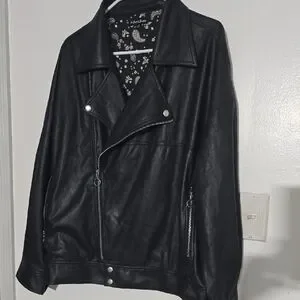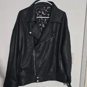 Stylish black faux leather jacket with silver hardware. Perfect for a chic look.
