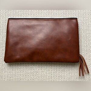 Chic and versatile, this striped black and white clutch features a stylish brown faux-leather accent. Perfect for any occasion. Lightweight, clean, and classic. Smoke-free and pet-free home.