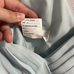 Tags still attached. Style JP1019. Chiffon style. Maxi dress. Lined. Zips in back. Morning sky coloring which is a light blue coloring. Faint pull at back otherwise great condition