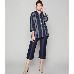 Keywords: Bryyn Walker, linen shirt, striped shirt, button down shirt, long sleeve shirt, women's top, casual blouse, oversized shirt, relaxed fit, high low hem, blue gray shirt, size L, linen clothing, made in USA