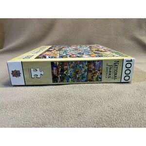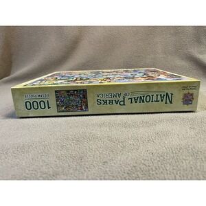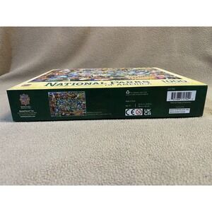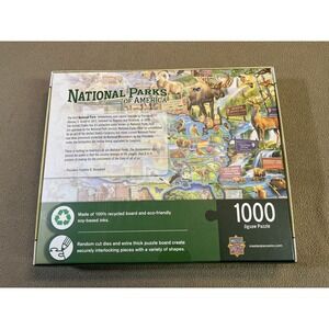 A 1000 piece jigsaw puzzle showcasing the National Parks of America. This puzzle features a vibrant collage of iconic national parks, wildlife, and landmarks across the United States, celebrating the beauty and diversity of these protected areas. Made with 100% recycled board and eco-friendly soy-based inks, it includes random cut dies and extra-thick puzzle board for securely interlocking pieces. Perfect for a relaxing evening indoors, a family activity, or a thoughtful gift for nature enthusiasts.