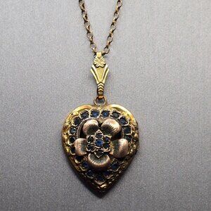 Victorian 12K Gold Filled Heart Locket Necklace Old Mine Cut Blue Paste Stones