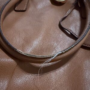 Stylish brown leather tote bag with gold accents. Perfect for everyday use.