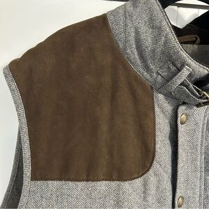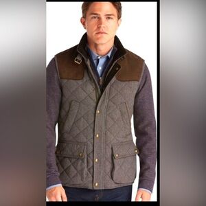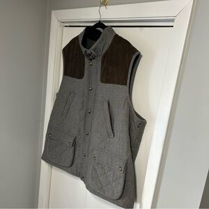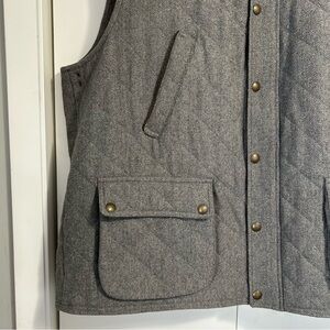 The Jos A Bank 1905 Quilted Vest is a stylish and versatile outerwear option for men, perfect for winter and fall seasons. Made from wool with a herringbone pattern, this tailored fit vest features a stand-up collar and buckle closure for a classic look. The quilted accents add a touch of sophistication, making it suitable for casual occasions or outdoor activities like walking, hunting, or hiking. Numerous pockets to keep hands warm and storage. Great pre owned condition.