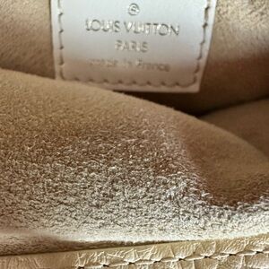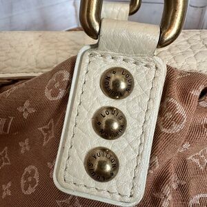 Louis Vuitton Mini Lin Trapeze GM From the 2005 Collection by Marc Jacobs Camel / Ivory Canvas & Leather Trim Monogram Mini Lin Brass Hardware Rolled Handles Alcantara Lining & Dual Interior Pockets Snap Closure at Top Protective Feet at Base Good Condition Clean Interior