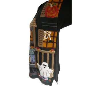 The Northern Isles Hand Knit Sweater is a unique and charming piece of women's vintage clothing. This measures approx. 22" from pit to pit and 28.5" from shoulder to bottom hem with 20.25" long sleeves. Made of a comfortable cotton blend material with shoulder pads, this original sweater features a colorful Halloween theme, perfect for casual occasions. Perfect for adding a vintage touch to your Halloween or fall ensemble, this sweater is sure to stand out.