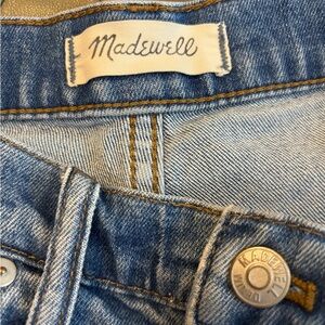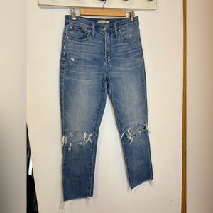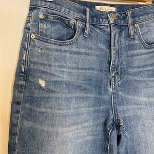Gently pre worn Madewell the Hight rise boy Jean knee rip edition. Light Wash. raw hem. Trendy, modern. (J2)