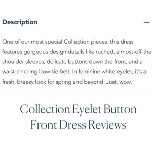 "One of our most special Collection pieces, this dress features gorgeous design details like ruched, almost-off-the shoulder sleeves, delicate buttons down the front, and a waist-cinching bow-tie belt. In feminine white eyelet, it's a fresh, breezy look for spring and beyond. Just, wow.