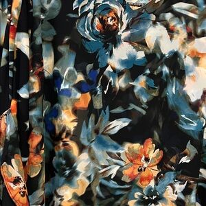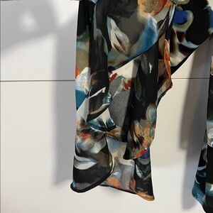 Like new. Chic floral blouse with a stylish V-neck. Features a vibrant mix of colors for a standout look. Front is sheer layered with beautiful sleeves.