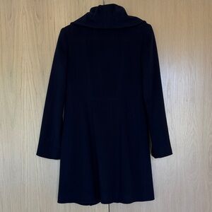 Discover elegance with this classic navy wool coat. Perfect for any occasion. Chest 18 1/2 inches across. Sleeve length 24 inches from shoulder to wrist. Length 35 inches from neck to bottom of back. Pockets and silky lining.