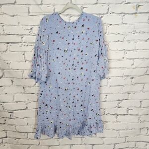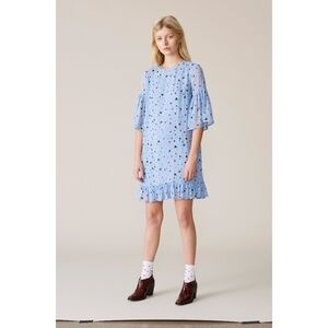This dress from Ganni is made from a synthetic gerogette fabric. It has a relaxed fit with flutter sleeves and hem. It is ue with floral pattern. It is in good used condition. It is marked a size 40 which is equivalent to a US 8.