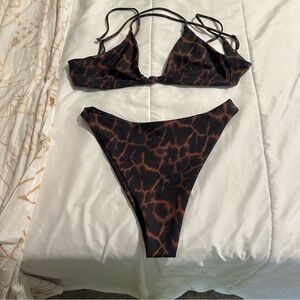 Bold bikini with striking black and brown pattern. Ideal for beach days.