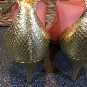 Lily Pulitzer “Natalie” open toe gold heels with a sleek design and reptile pattern. Ankle straps show a tiny bit of wear but otherwise in EUC. Perfect for a night out.