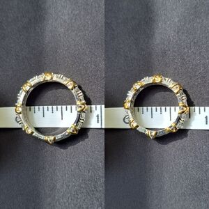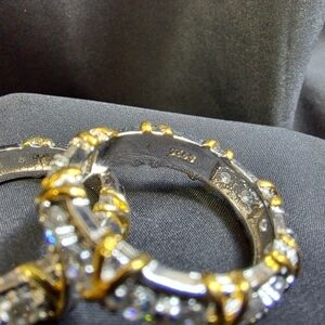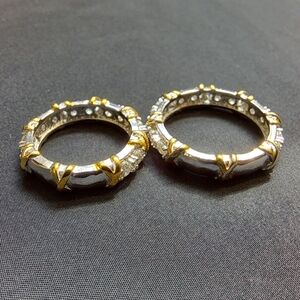 The insides of the bands are stamped 6925, which indicates that they are 69.25% sterling silver with the remaining percentage being made up of other metals or alloys. There are no other stamps or hallmarks. Rings feature a gold plated X pattern. Both rings have all of their stones. Stones are simulated and are lightweight.