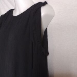 Stylish black dress from Old Navy. Versatile and timeless, it gives a new twist on the little black dress. Cold shoulder with ruffles. Gauze like material. It's fully lined. It has a keyhole back closure. Measurements are: pit to pit 20 inches, and length is 35 inches from shoulder to hem.