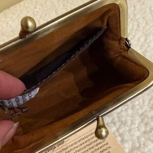 Unique Patricia Nash coin purse with vintage map print. Features a keychain attachment. Perfect for travel enthusiasts. Beautiful Patricia – leather hardware is an antique brass coin purse is functional with an interior slot to also put a card. measurements: