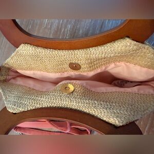 Embrace summer with this vibrant canvas tote or use as a crossbody with fun coral adjustable strap. Bag features a tropical design. The bag showcases a playful mix of green leaves and pink flowers, complemented by sturdy wooden handles. Perfect for beach days or casual outings.
