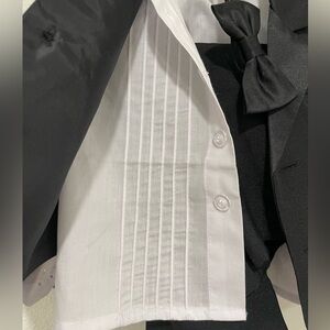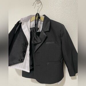 Black 5 piece baby tuxedo. Suit jacket, shirt, vest, pants and bow tie. Tried it on my son for 5 minutes and ended up wearing a cream suit for the wedding instead. Perfect for formal occasions. Size 6-9 months