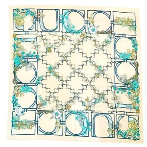 Authentic Gucci silk scarf featuring an elegant floral trellis design with signature GG-style framing. This stunning piece showcases soft peach tones accented with teal, ivory, and gold florals—classic yet fresh and highly versatile. Crafted in Italy from luxurious 100% silk with a beautiful drape and hand-rolled edges.