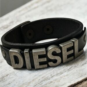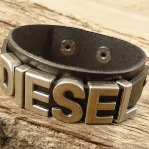 Bold Diesel bracelet. Black band with silver lettering. Stylish and modern.