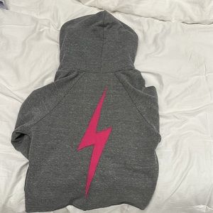 Gray hoodie with vibrant rainbow sleeve stripes. Pink lightning bolt detail. Soft and stylish.