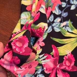 Design: Long sleeves with a black background and a multi-color orchid/tropical floral pattern (pinks, greens, blues)