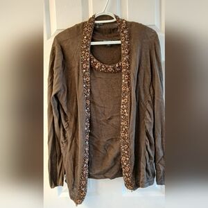Lafayette 148 New York Linen Blend Tank & Cardigan Sweater Set – Brown – Beaded – Size Large