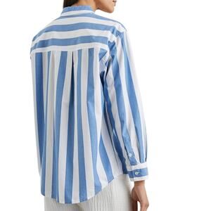 Features soft cotton-lyocell fabric in wide blue and white stripes, a relaxed fit, single front pocket, and button cuffs. Lightweight and breathable with a casual, polished feel — perfect with denim, linen trousers, or over swimwear.