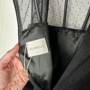 NWOT Black Mesh Alamour Sexy Sheer PolkadotOverlay Corset Bodice Long Train Wedding Black Tie Dress