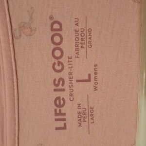 Life Is Good Light Pink V-Neck Tee with Pink Flamingo Pattern. Size Large.