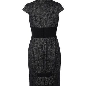 Karen Millen black and grey wool sheath knee length dress with square neckline, cap sleeves, and belted waist. Wool/polyester shell. Subtle ruffle detail on back. Great condition, perfect corporate chic look. Very flattering!