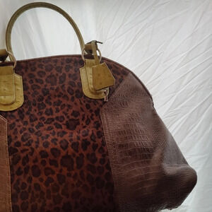 OMG! This bag is literally fabulous! Large enough to take a weekend worth of clothing plus the essentials. Genuine Italian croco embossed leather, pony hair in cheetah print, Ostrich trim in olive green, silver hardware, with lock and two keys and fob to hold them. But wait, there's more... the inside is lined with plush olive green velvet and the rest you have to see for yourself. The bag is stunning! 100% authentic.