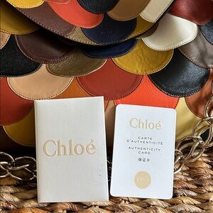 Authentic, new Chloe – JUANA medium bag. In scalloped patchwork, CPA Brown. Shades of tan, olive, rust, ivory, navy, black, orange. Features gold chain. This bag has never been carried. Includes original attached tag and authenticity certificate.