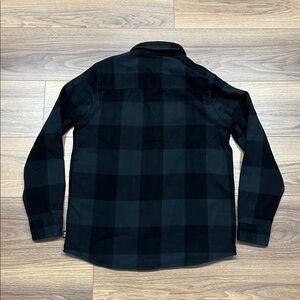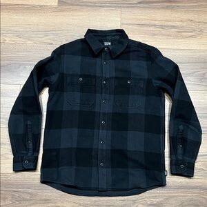 Mountain Hardwear Plusher LongSleeve Flannel in Black Tatanka Check Print, a Black/Gray plaid. Size Medium. Excellent preowned condition, gently worn. Pit to pit measures 21” and length 29”.