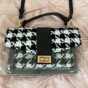 Chic crossbody with houndstooth pattern. Features adjustable strap and secure clasp. Stylish and versatile.