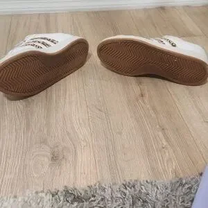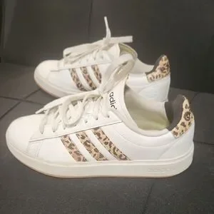 Stylish Adidas sneakers with white base and leopard print accents. Perfect for a trendy look.