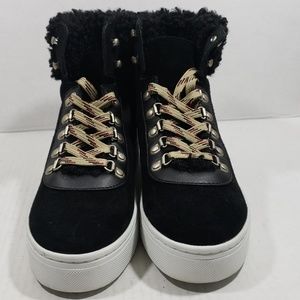 Stylish black sneakers with white soles. Features cozy lining and unique laces. Perfect for casual wear.
