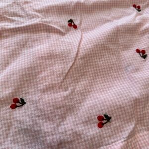 Charming pink gingham pajama set with embroidered cherry details. Short-sleeve top and matching shorts with pockets. These are so cute!! They are pretty wrinkled from being in my drawer, but a quick iron will make these look like new!