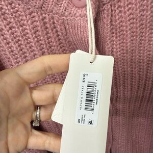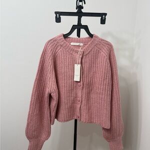 Chic pink cardigan with a cozy knit texture. Ideal for layering and adding warmth.