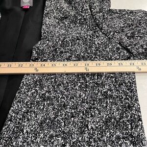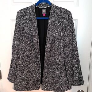 Vince Camuto jacket . designer blazer . tailored blazer . open front blazer . classic blazer . career wear . office wear . business casual . professional style . workwear . interview outfit . office jacket . marled fabric . black and white blazer . textured blazer . tweed style blazer . neutral blazer . monochrome . size 14 blazer . flattering fit . layering piece . capsule wardrobe . wardrobe staple . polished look . lightweight blazer . all season blazer . travel friendly . wrinkle resistant . everyday chic