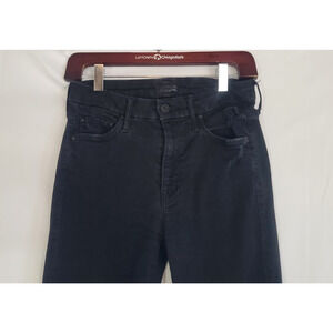 The product is a pair of Mother Black Guilty As Sin women's jeans in size 25. These ankle fray jeans feature a solid black color with a dark wash, made from a cotton blend denim fabric. They have a mid-rise fit with a regular style, zip and button closure, and a 27-inch inseam. Perfect for summer, fall, and winter, these jeans are a stylish and versatile addition to any woman's wardrobe.