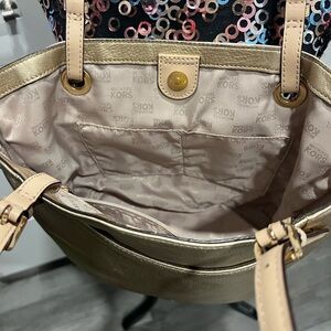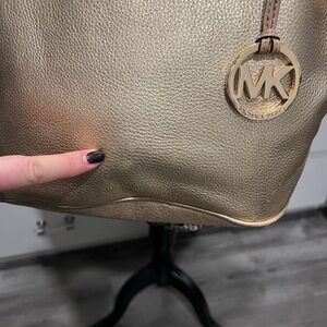 -Beautiful gold hardware with MK emblem hang tag and MK insignia on openings that straps go through
