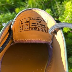 Dr Martens 1461 Oxford lace up shoe. Smooth Leather. Olive Green color. Men’s size 9. Excellent condition. Slight creasing on top of shoe as shown in photo.