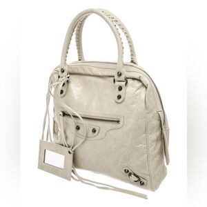 Very good condition vintage Balenciaga mini bowling bag crafted in soft neutral lambskin with gunmetal hardware. Features rolled handles, whipstitch trim, front zip pocket, and the signature hanging mirror tag. A less common silhouette than the City bag, making it especially collectible.