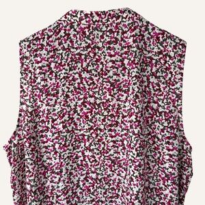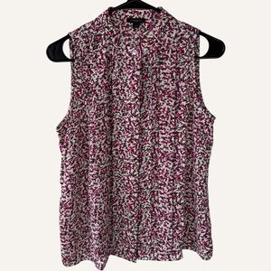Keywords: Ann Taylor, Sleeveless blouse, Floral print, Magenta top, Romantic feminine, Boho chic, Cottagecore, Spring fashion, Summer top, Office wear, Date night, Preppy.