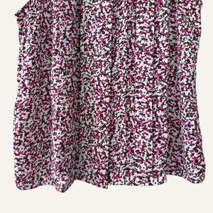 Elevate your wardrobe with this stunning Ann Taylor sleeveless blouse! Perfect for capturing a romantic feminine aesthetic, this top features a beautiful, vibrant magenta, white, and black abstract floral print. The lightweight, flowy fabric makes it an essential piece for spring and summer date nights or garden parties.