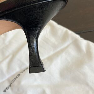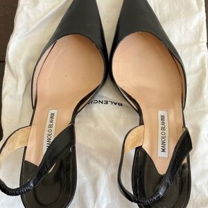 Chic black slingback 2.5” (50 mm) heels by Manolo Blahnik. His classic design with pointed toe, slightly stretchy heel strap and curved stiletto heel in a matte black leather. I have used these a few times and because I have big feet they are not comfortable at all, though I have enjoyed looking at them in my closet for 10+ years! They are in a Balenciaga shoe bag, can’t explain why!? Size 42 which is 11-11.5 US in my experience